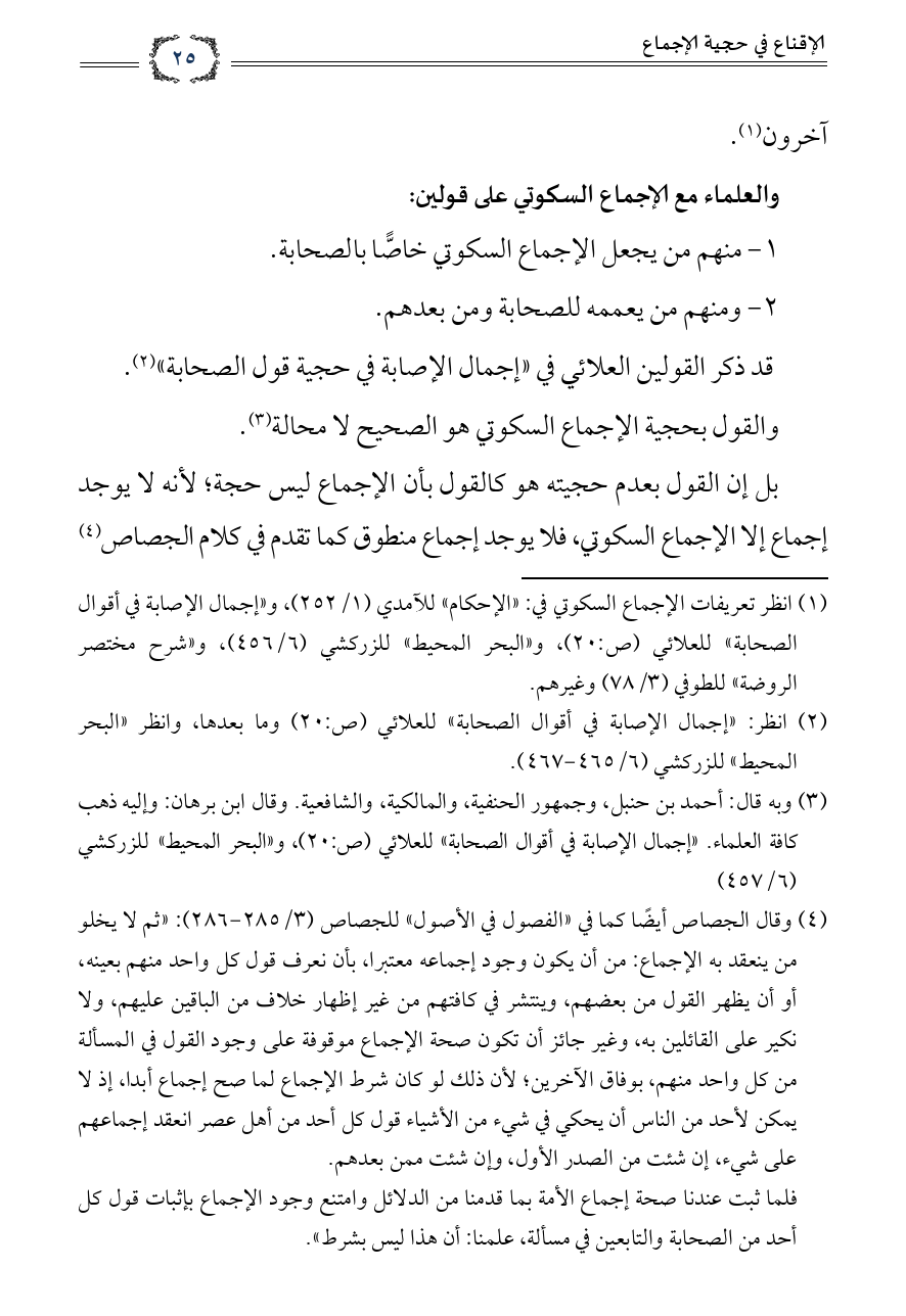 (¬١) انظر تعريفات الإجماع السكوتي في: «الإحكام» للآمدي (١/ ٢٥٢)، و «إجمال الإصابة في أقوال الصحابة» للعلائي (ص:٢٠)، و «البحر المحيط» للزركشي (٦/ ٤٥٦)، و «شرح مختصر الروضة» للطوفي (٣/ ٧٨) وغيرهم.