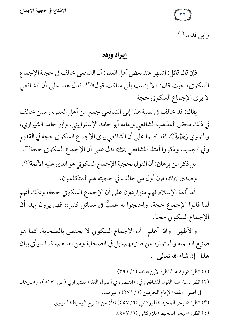 يقال: قد خالف في نسبة هذا إلى الشافعي جمع من أهل العلم، وممن خالف في ذلك محقق المذهب الشافعي وإمامه أبو حامد الإسفراييني، وأبو حامد الشيرازي، والنووي رحمه الله تعالى، فقد نصوا على أن الشافعي يرى الإجماع السكوتي حجة في القديم وفي الجديد، وذكروا أمثلة للشافعي رحمه الله تعالى تدل على أن الإجماع السكوتي حجة (¬٣).
