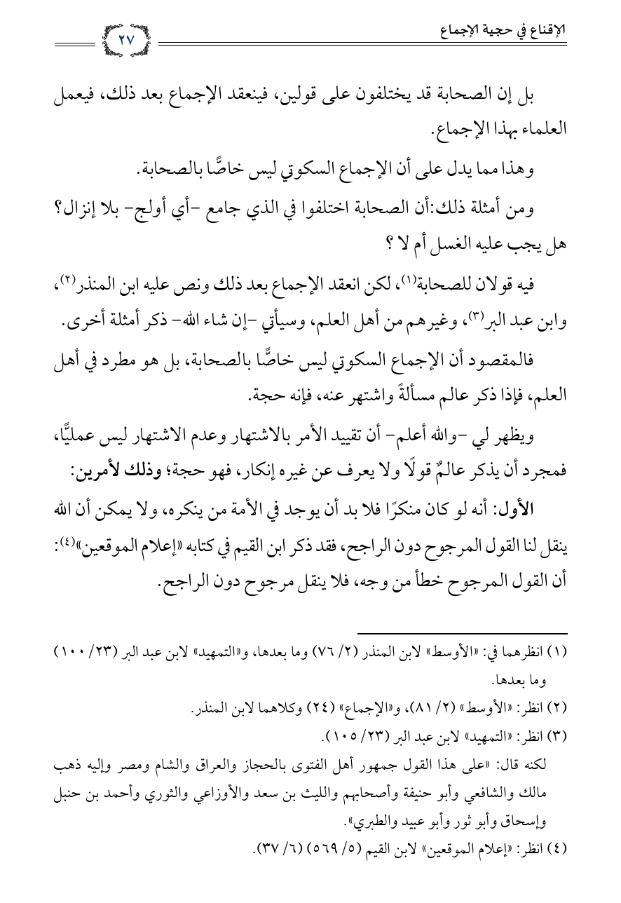 ويظهر لي - والله أعلم - أن تقييد الأمر بالاشتهار وعدم الاشتهار ليس عمليًا، فمجرد أن يذكر عالمٌ قولًا ولا يعرف عن غيره إنكار فهو حجة، وذلك لأمرين: