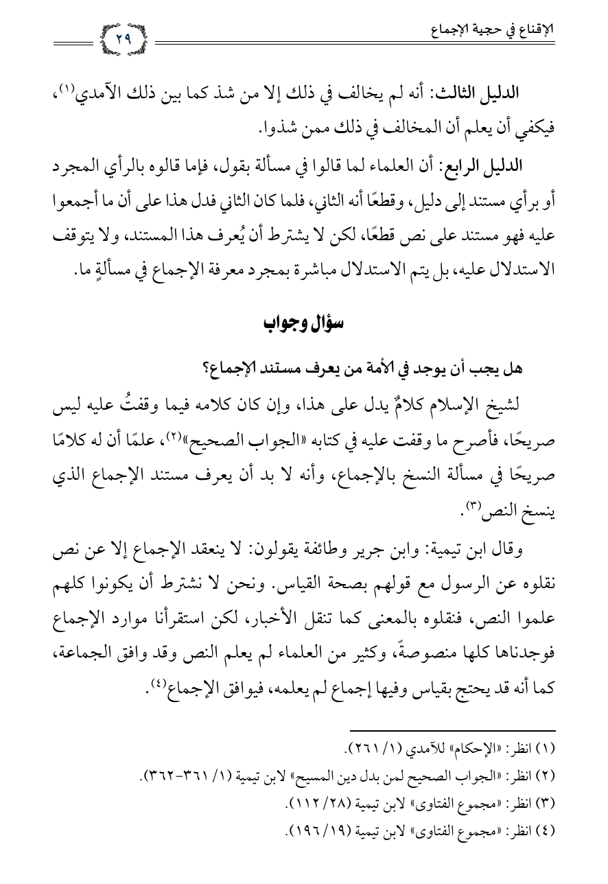 الدليل الثالث: أنه لم يخالف في ذلك إلا من شذ كما بين ذلك الآمدي (¬١)، فيكفي أن يعلم أن المخالف في ذلك ممن شذوا.