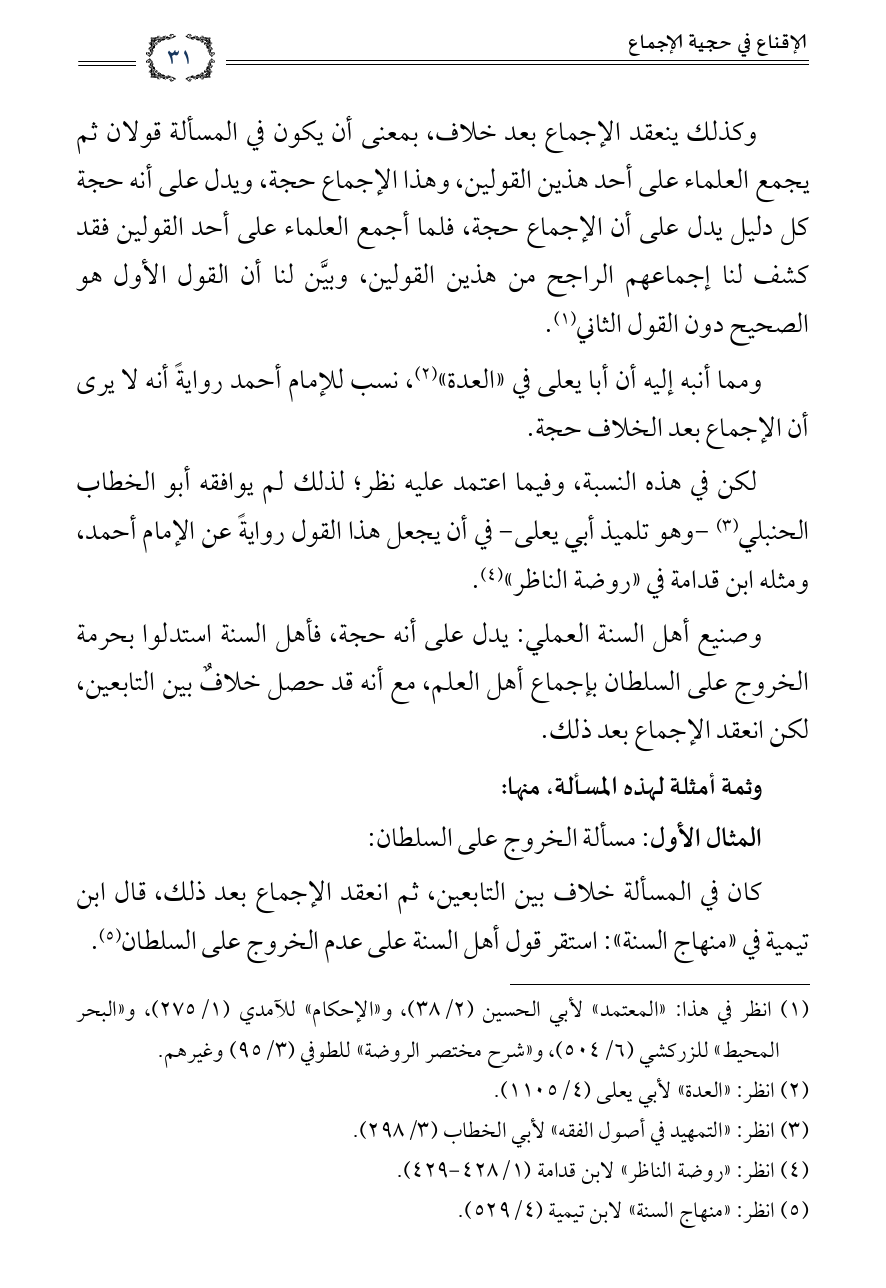 المثال الأول: مسألة الخروج على السلطان كان في المسألة خلاف بين التابعين ثم انعقد الإجماع بعد ذلك قال ابن تيمية في «منهاج السنة»: استقر قول أهل السنة على عدم الخروج على السلطان (¬٥).