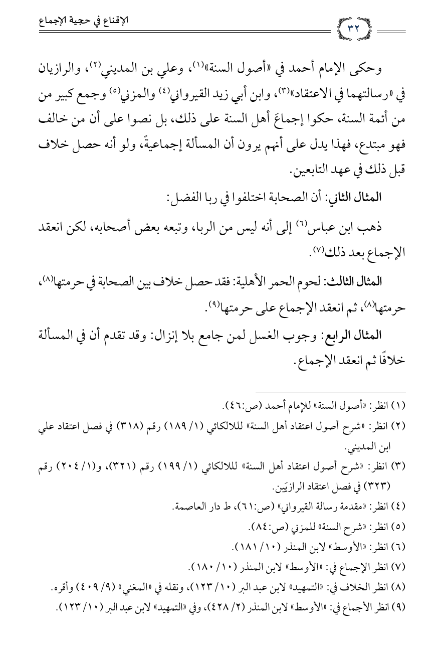 وحكى الإمام أحمد في «أصول السنة» (¬١)، وعلي بن المديني (¬٢)، والرازيان في «رسالتهما في الاعتقاد» (¬٣)، وابن أبي زيد القيرواني (¬٤) والمزني (¬٥) وجمع كبير من أئمة السنة إجماعَ أهل السنة على ذلك بل نصوا على أن من خالف فهو مبتدع، فهذا يدل على أنهم يرون أن المسألة إجماعية ولو أنه حصل خلاف قبل ذلك في عهد التابعين.