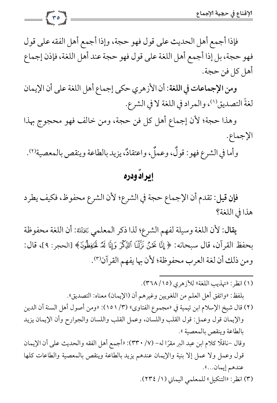 فإذا أجمع أهل الحديث على قول فهو حجة، وإذا أجمع أهل الفقه على قول فهو حجة، بل إذا أجمع أهل اللغة على قول فهو حجة عند أهل اللغة، فإذن إجماع أهل كل فن حجة.