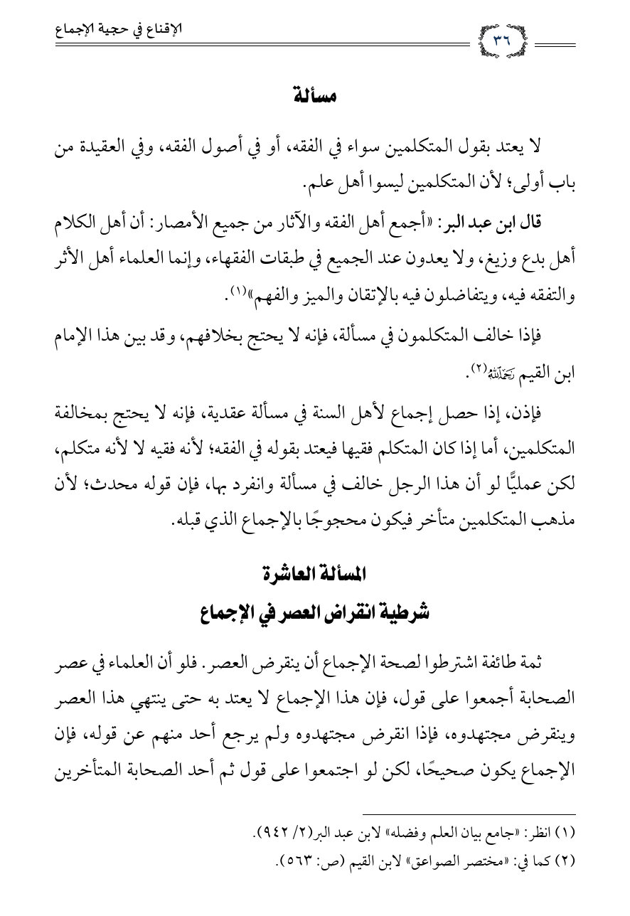 فإذا خالف المتكلمون في مسألة فإنه لا يحتج بخلافهم وقد بين هذا الإمام ابن القيم رحمه الله تعالى (¬٢).