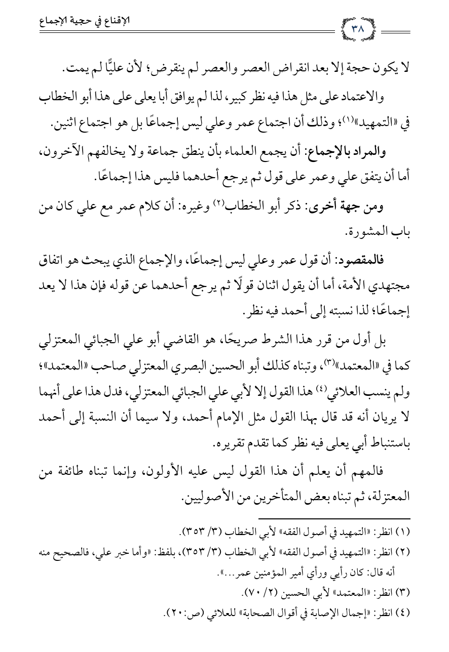 بل أول من قرر هذا الشرط صريحا، هو القاضي أبو علي الجبائي المعتزلي كما في «المعتمد» (¬٣)، وتبناه كذلك أبو الحسين البصري المعتزلي صاحب المعتمد؛ ولم ينسب العلائي (¬٤) هذا القول إلا لأبي علي الجبائي المعتزلي، فدل هذا على أنهما لا يريان أنه قد قال بهذا القول مثل الإمام أحمد ولا سيما أن النسبة إلى أحمد باستنباط أبي يعلى فيه نظر كما تقدم تقريره.