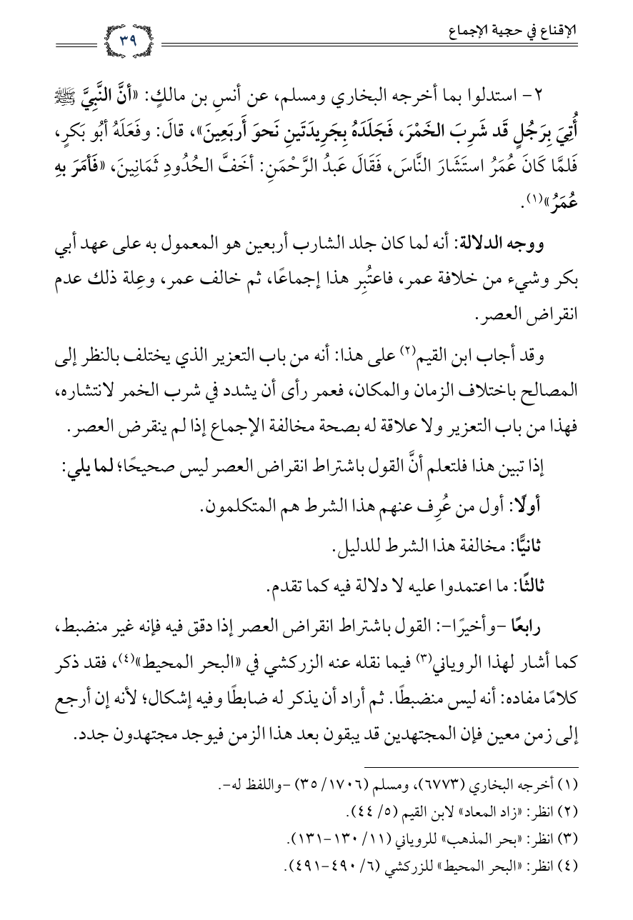 ووجه الدلالة: أنه لما كان جلد الشارب أربعين هو المعمول به على عهد أبي بكر وشيء من خلافة عمر فاعتُبِر هذا إجماعًا، ثم خالف عمر، وعلة ذلك عدم انقراض العصر.