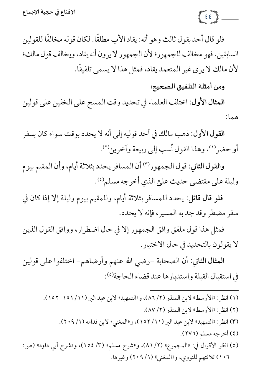 (¬٣) انظر: «التمهيد» لابن عبد البر (١١/ ١٥٢)، و «المغني» لابن قدامه (١/ ٢٠٩).