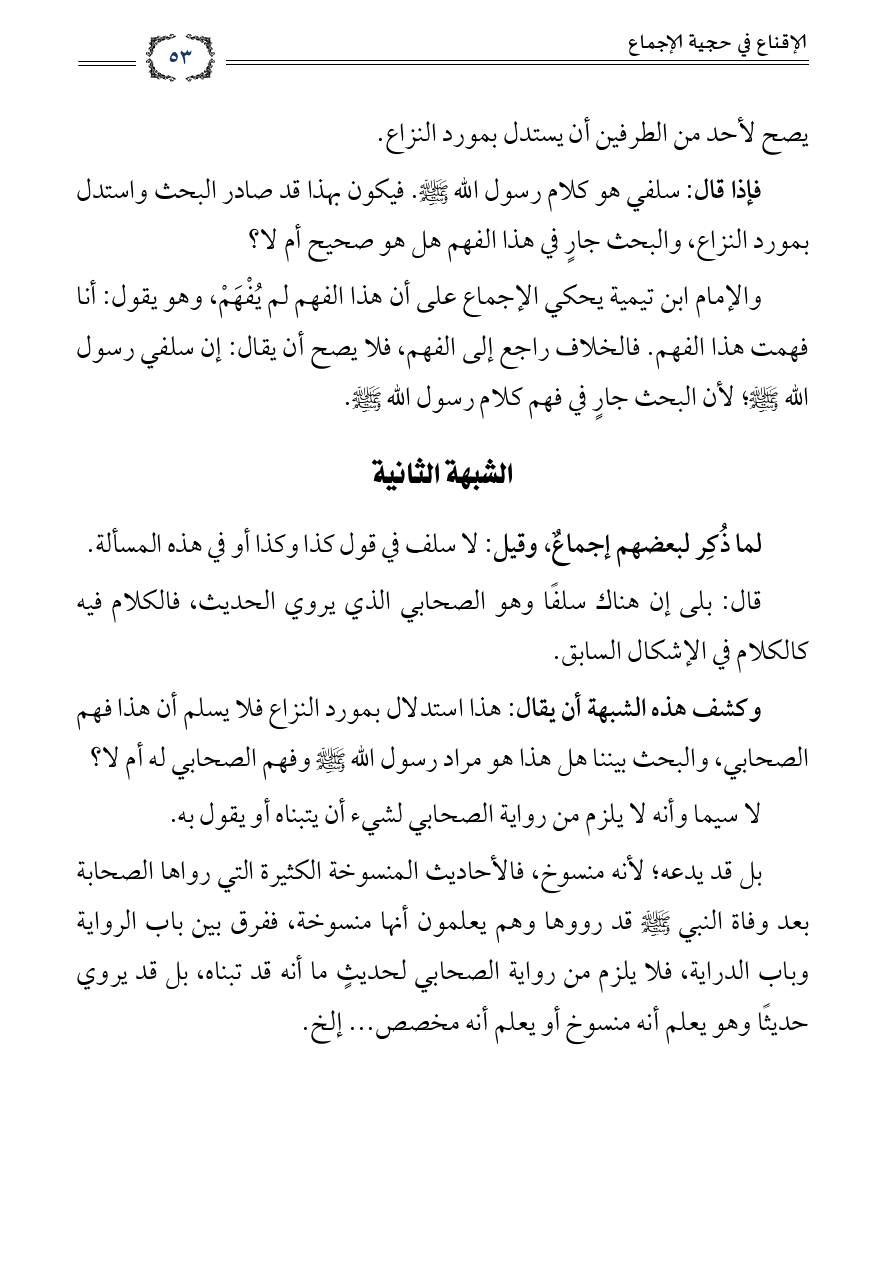 وكشف هذه الشبهة أن يقال: هذا استدلال بمورد النزاع فلا يسلم أن هذا فهم الصحابي، والبحث بيننا هل هذا هو مراد رسول الله صلى الله عليه وسلم وفهم الصحابي له أم لا؟