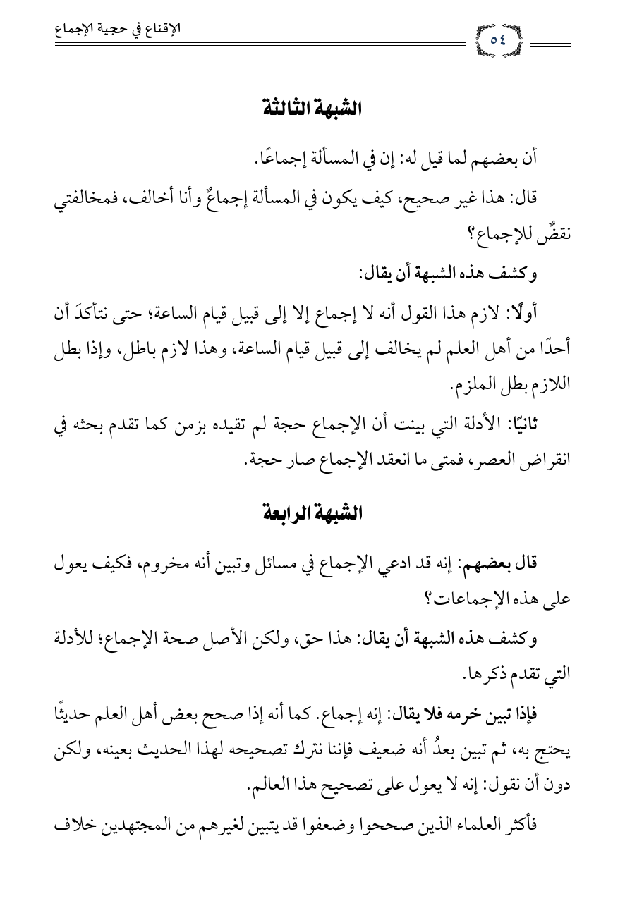 وكشف هذه الشبهة أن يقال: هذا حق؛ ولكن الأصل صحة الإجماع للأدلة التي تقدم ذكرها.
