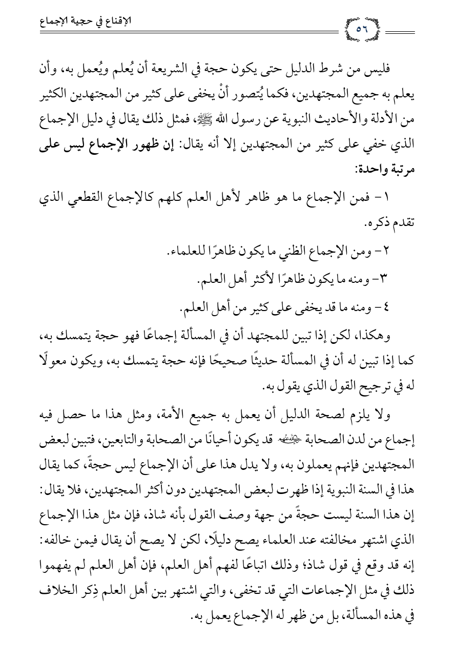 فليس من شرط الدليل حتى يكون حجة في الشريعة أن يعلم ويعمل به، وأن يعلم به جميع المجتهدين، فكما يُتصور أنْ يخفى على كثير من المجتهدين الكثير من الأدلة والأحاديث النبوية عن رسول الله صلى الله عليه وسلم فمثل ذلك يقال في دليل الإجماع الذي خفي على كثير من المجتهدين إلا أنه يقال: إن ظهور الإجماع ليس على مرتبة واحدة: