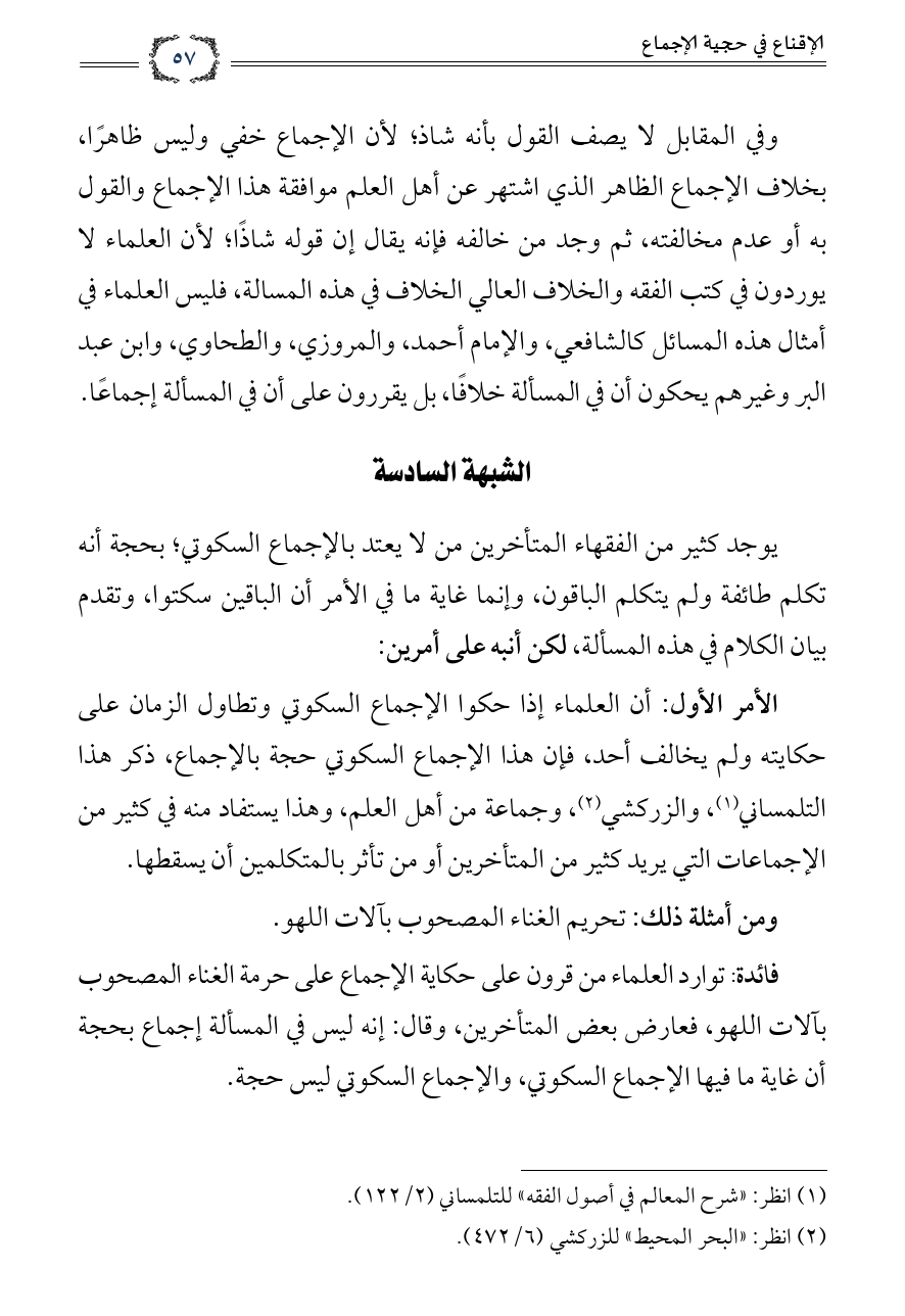 فائدة: توارد العلماء من قرون على حكاية الإجماع على حرمة الغناء المصحوب بآلات اللهو فعارض بعض المتأخرين وقال: إنه ليس في المسألة إجماع بحجة أن غاية ما فيها الإجماع السكوتي، والإجماع السكوتي ليس حجة.