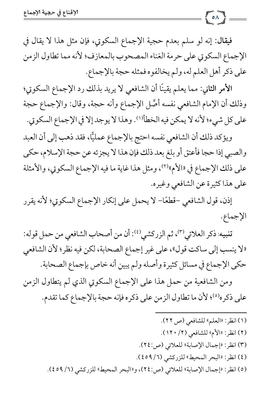 الأمر الثاني: مما يعلم يقيناً أن الشافعي لا يريد بذلك رد الإجماع السكوتي وذلك أن الإمام الشافعي نفسه أصَّل الإجماع وأنه حجة وقال: والإجماع حجة على كل شيء؛ لأنه لا يمكن فيه الخطأ (¬١). وهذا لا يوجد إلا في الإجماع السكوتي.