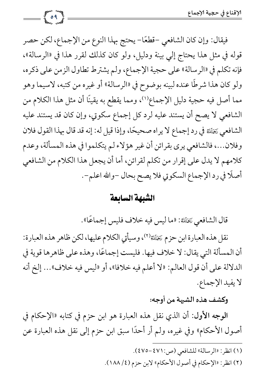 فيقال: وإن كان الشافعي قطعاً يحتج بهذا النوع من الإجماع لكن حصر قوله في مثل هذا يحتاج إلي بينة ودليل، ولو كان كذلك لقرر هذا في «الرسالة»، فإنه تكلم في «الرسالة» على حجية الإجماع، ولم يشترط تطاول الزمن على ذكره، ولو كان هذا شرطاً عنده لبينه بوضوح في «الرسالة» أو غيره من كتبه لاسيما وهو مما أصل فيه حجية دليل الإجماع (¬١)، ومما يقطع به يقينًا أن مثل هذا الكلام من الشافعي لا يصح أن يستند عليه لرد كل إجماع سكوتي، وإن كان قد يستند عليه الشافعي -رحمه الله- في رد إجماع لا يراه صحيحًا، وإذا قيل له: إنه قد قال بهذا القول فلان وفلان ... فالشافعي يرى بقرائن أن غير هؤلاء لم يتكلموا في هذه المسألة، وعدم كلامهم لا يدل على إقرار من تكلم لقرائن، أما أن يجعل هذا الكلام من الشافعي أصلاً في رد الإجماع السكوتي فلا يصح بحال - والله اعلم -.