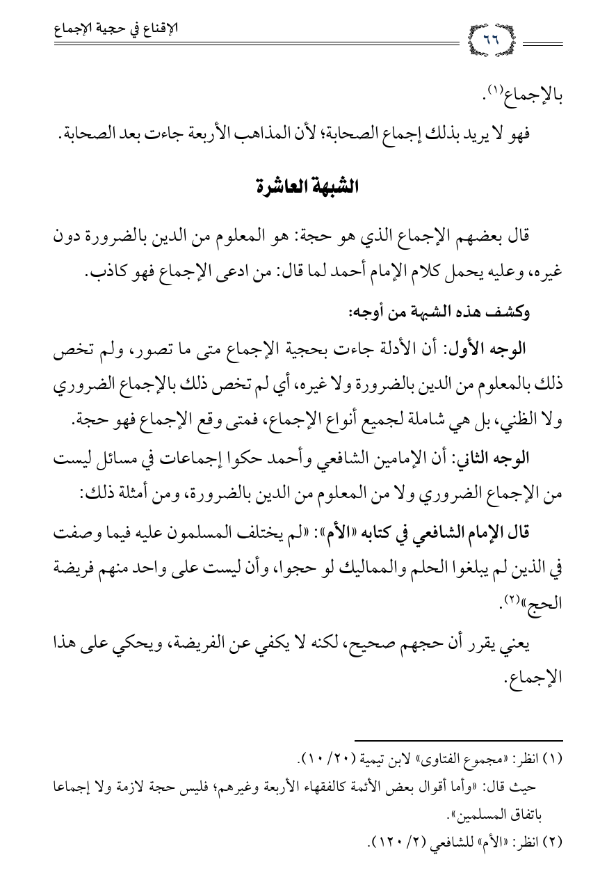 قال بعضهم الإجماع الذي هو حجة هو المعلوم من الدين بالضرورة دون غيره، وعليه يحمل كلام الإمام أحمد لما قال: من ادعى الإجماع فهو كاذب.