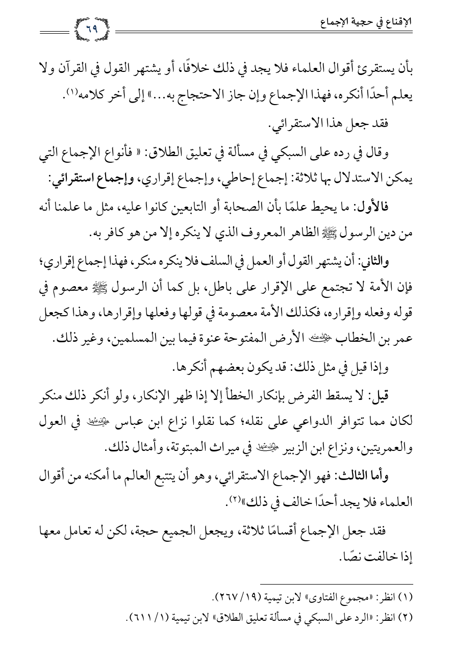 وقال في رده على السبكي في مسألة في تعليق الطلاق: «فأنواع الإجماع التي يمكن الاستدلال بها ثلاثة: إجماع إحاطي، وإجماع إقراري، وإجماع استقرائي: