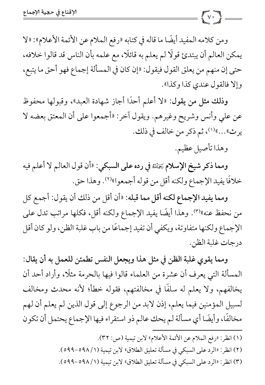 ومما ذكر شيخ الإسلام رحمه الله تعالى في رده على السبكي: «أن قول العالم لا أعلم فيه خلافاً يفيد الإجماع ولكنه أقل من قوله أجمعوا» (¬٢). وهذا حق.