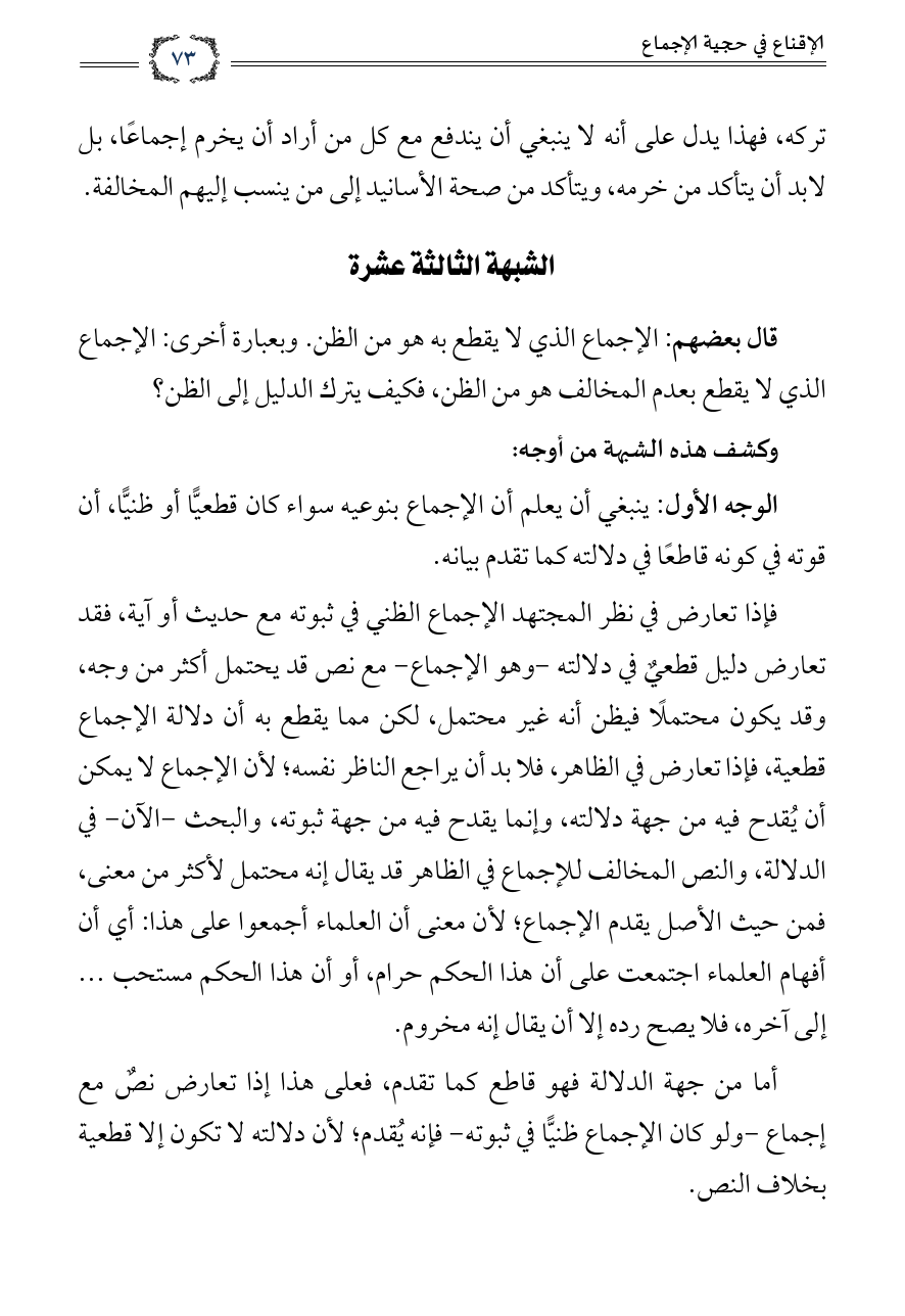 الوجه الأول: ينبغي أن يعلم أن الإجماع بنوعيه سواءً كان قطعياً أو ظنياً، أن قوته في كونه قاطعاً في دلالته كما تقدم بيانه.