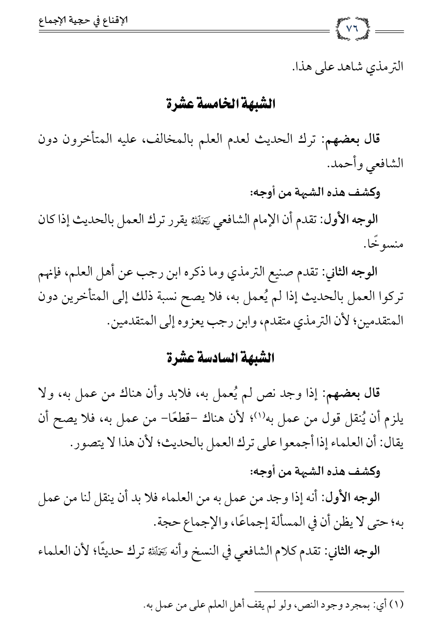الوجه الثاني: تقدم صنيع الترمذي وما ذكره ابن رجب عن أهل العلم فإنهم تركوا العمل بالحديث إذا لم يُعمل به، فلا يصح نسبة ذلك إلى المتأخرين دون المتقدمين؛ لأن الترمذي متقدم وابن رجب يعزوه إلى المتقدمين.