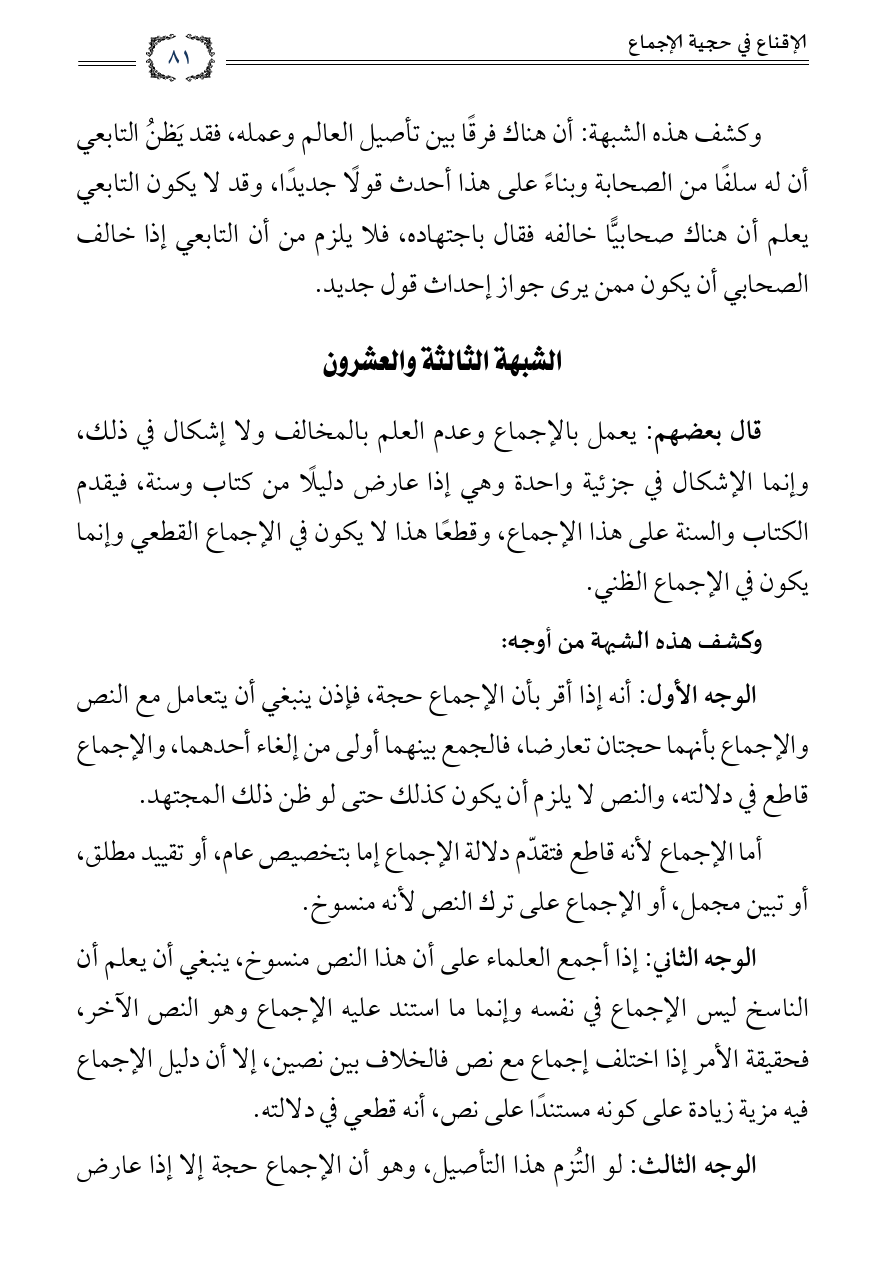 الوجه الأول: أنه إذا أقر بأن الإجماع حجة فإذن ينبغي أن يتعامل مع النص والإجماع بأنهما حجتان تعارضا فالجمع بينهما أولى من إلغاء أحدهما، والإجماع قاطع في دلالته والنص لا يلزم أن يكون كذلك حتى لو ظن ذلك المجتهد.