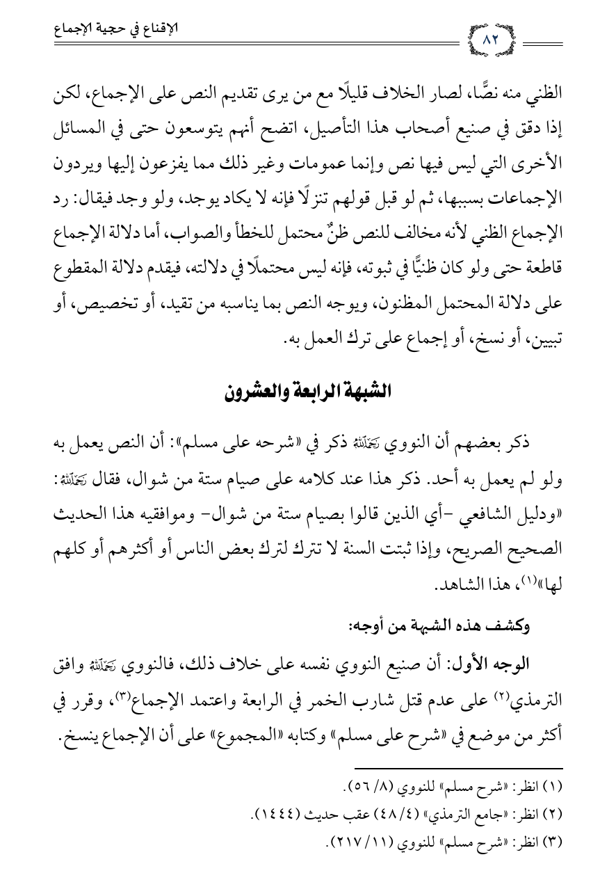 الوجه الأول: أن صنيع النووي نفسه على خلاف ذلك، فالنووي رحمه الله تعالى وافق الترمذي (¬٢) على عدم قتل شارب الخمر في الرابعة واعتمد الإجماع (¬٣) وقرر في أكثر من موضع في «شرح على مسلم» وكتابه «المجموع» على أن الإجماع ينسخ.