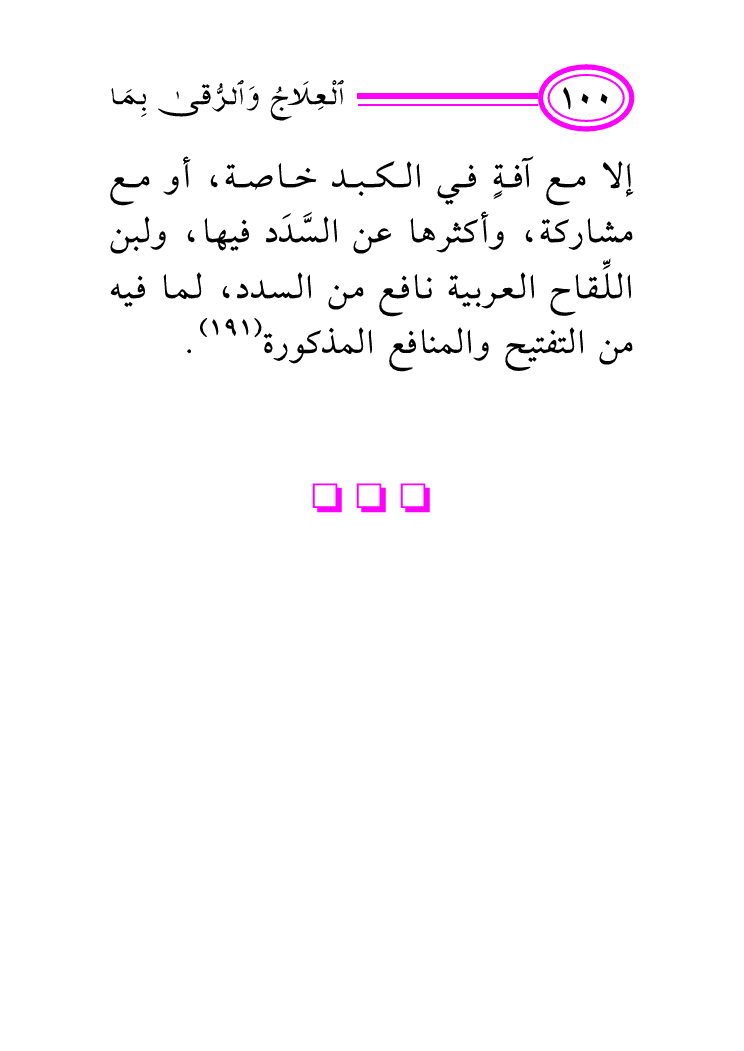 إلا مع آفةٍ في الكبد خاصة، أو مع مشاركة، وأكثرها عن السَّدَد فيها، ولبن اللِّقاح العربية نافع من السدد، لما فيه من التفتيح والمنافع المذكورة (¬191) .