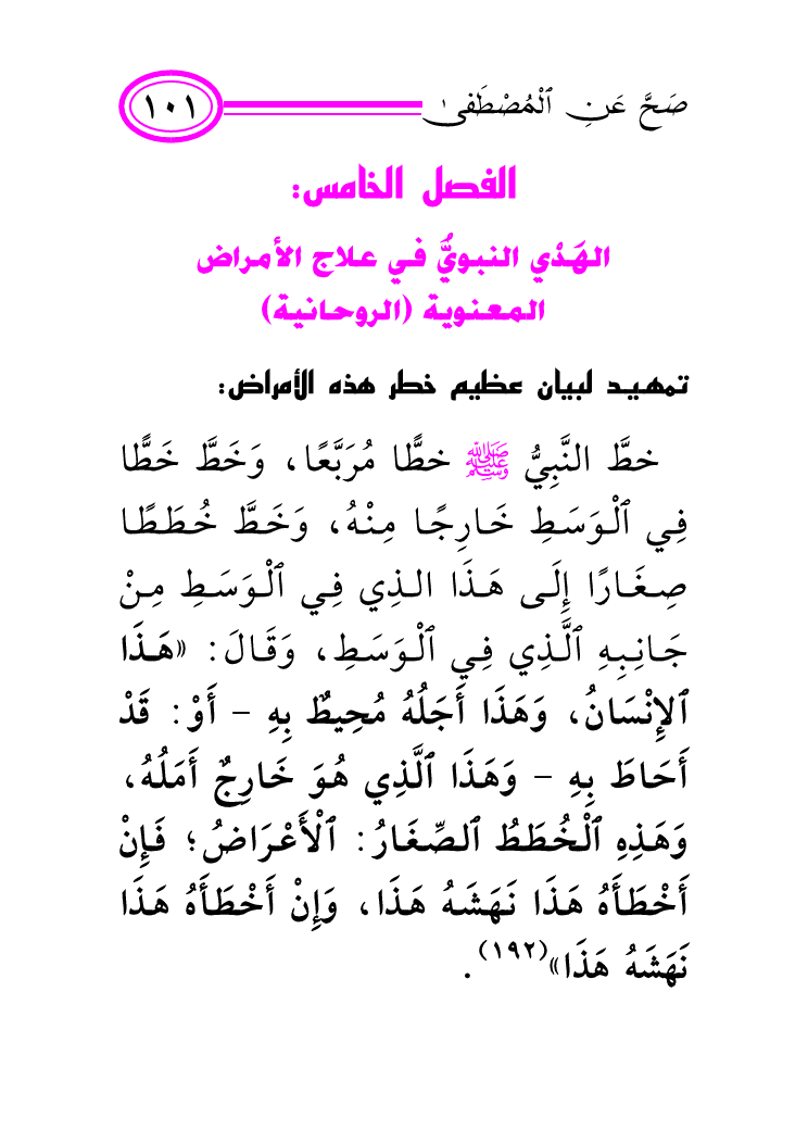خطَّ النَّبِيُّ صلى الله عليه وسلم خطًّا مُرَبَّعًا، وَخَطَّ خَطًّا فِي الْوَسَطِ خَارِجًا مِنْهُ، وَخَطَّ خُطَطًا صِغَارًا إِلَى هَذَا الذِي فِي الْوَسَطِ مِنْ جَانِبِهِ الَّذِي فِي الْوَسَطِ، وَقَالَ: «هَذَا الإِنْسَانُ، وَهَذَا أَجَلُهُ مُحِيطٌ بِهِ - أَوْ: قَدْ أَحَاطَ بِهِ - وَهَذَا الَّذِي هُوَ خَارِجٌ أَمَلُهُ، وَهَذِهِ الْخُطَطُ الصِّغَارُ: الأَْعْرَاضُ؛ فَإِنْ أَخْطَأَهُ هَذَا نَهَشَهُ هَذَا، وَإِنْ أَخْطَأَهُ هَذَا نَهَشَهُ هَذَا» (¬192) .