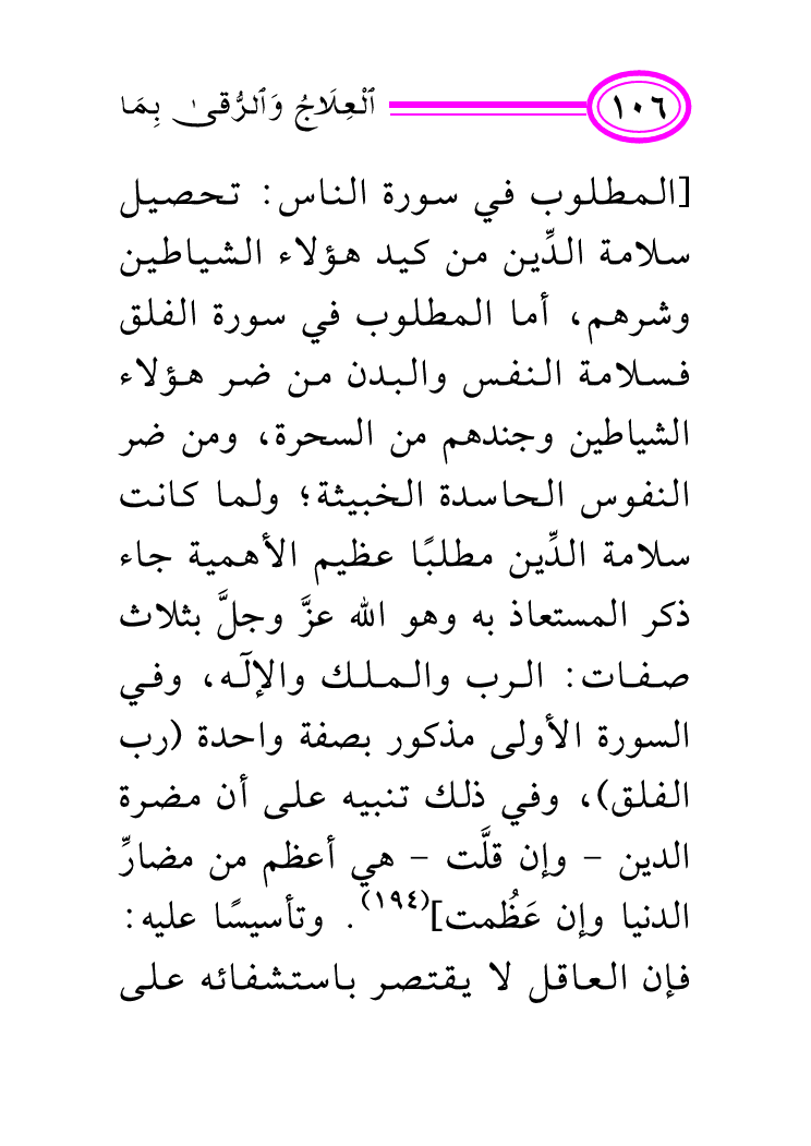 [المطلوب في سورة الناس: تحصيل سلامة الدِّين من كيد هؤلاء الشياطين وشرهم، أما المطلوب في سورة الفلق فسلامة النفس والبدن من ضر هؤلاء الشياطين وجندهم من السحرة، ومن ضر النفوس الحاسدة الخبيثة؛ ولما كانت سلامة الدِّين مطلبًا عظيم الأهمية جاء ذكر المستعاذ به وهو الله عزَّ وجلَّ بثلاث صفات: الرب والملك والإله، وفي السورة الأولى مذكور بصفة واحدة (رب الفلق) ، وفي ذلك تنبيه على أن مضرة الدين - وإن قلَّت - هي أعظم من مضارِّ الدنيا وإن عَظُمت] (¬194) .