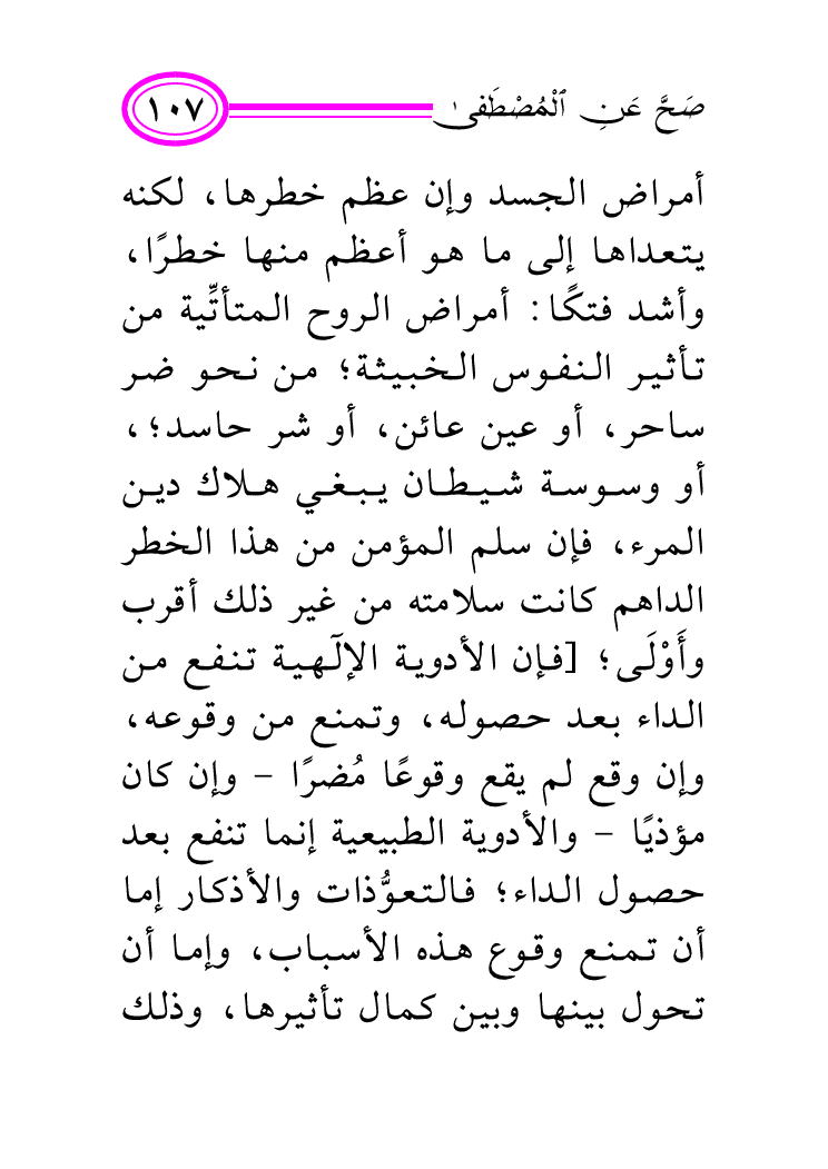 أمراض الجسد وإن عظم خطرها، لكنه يتعداها إلى ما هو أعظم منها خطرًا، وأشد فتكًا: أمراض الروح المتأتِّية من تأثير النفوس الخبيثة؛ من نحو ضر ساحر، أو عين عائن، أو شر حاسد؛، أو وسوسة شيطان يبغي هلاك دين المرء، فإن سلم المؤمن من هذا الخطر الداهم كانت سلامته من غير ذلك أقرب وأَوْلَى؛ [فإن الأدوية الإلهية تنفع من الداء بعد حصوله، وتمنع من وقوعه، وإن وقع لم يقع وقوعًا مُضرًا - وإن كان مؤذيًا - والأدوية الطبيعية إنما تنفع بعد حصول الداء؛ فالتعوُّذات والأذكار إما أن تمنع وقوع هذه الأسباب، وإما أن تحول بينها وبين كمال تأثيرها، وذلك