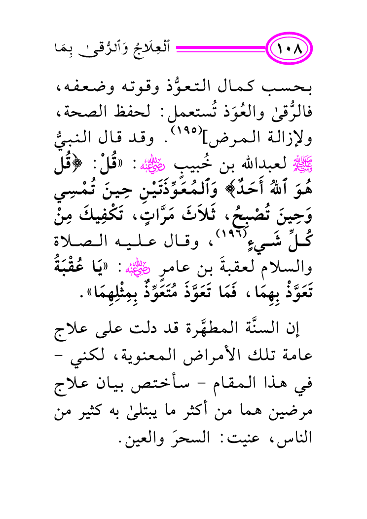 بحسب كمال التعوُّذ وقوته وضعفه، فالرُّقى والعُوَذ تُستعمل: لحفظ الصحة، ولإزالة المرض] (¬195) . وقد قال النبيُّ صلى الله عليه وسلم لعبد الله بن خُبيبٍ رضي الله عنه: «قُلْ: {قُل هُوَ اللهُ أَحَدٌ} وَالمُعَوِّذَتَيْنِ حِينَ تُمْسِي وَحِينَ تُصْبِحُ، ثَلاَثَ مَرَّاتٍ، تَكْفِيكَ مِنْ كُلِّ شَيءٍ (¬196) ، وقال عليه الصلاة والسلام لعقبةَ بن عامرٍ رضي الله عنه: «يَا عُقْبَةُ تَعَوَّذْ بِهِمَا، فَمَا تَعَوَّذَ مُتَعَوِّذٌ بِمِثْلِهِمَا» .
