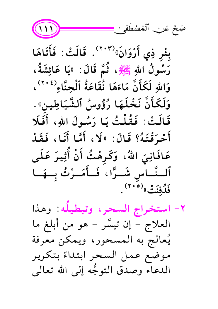 (¬205) متفق عليه من حديث السيدة عائشة رضي الله عنها: أخرجه البخاري؛ كتاب الطِبّ، باب: هل يستخرج السحر؟ برقم (5765) ، ومسلم؛ كتاب: السلام، باب: السحر، برقم (2189) .