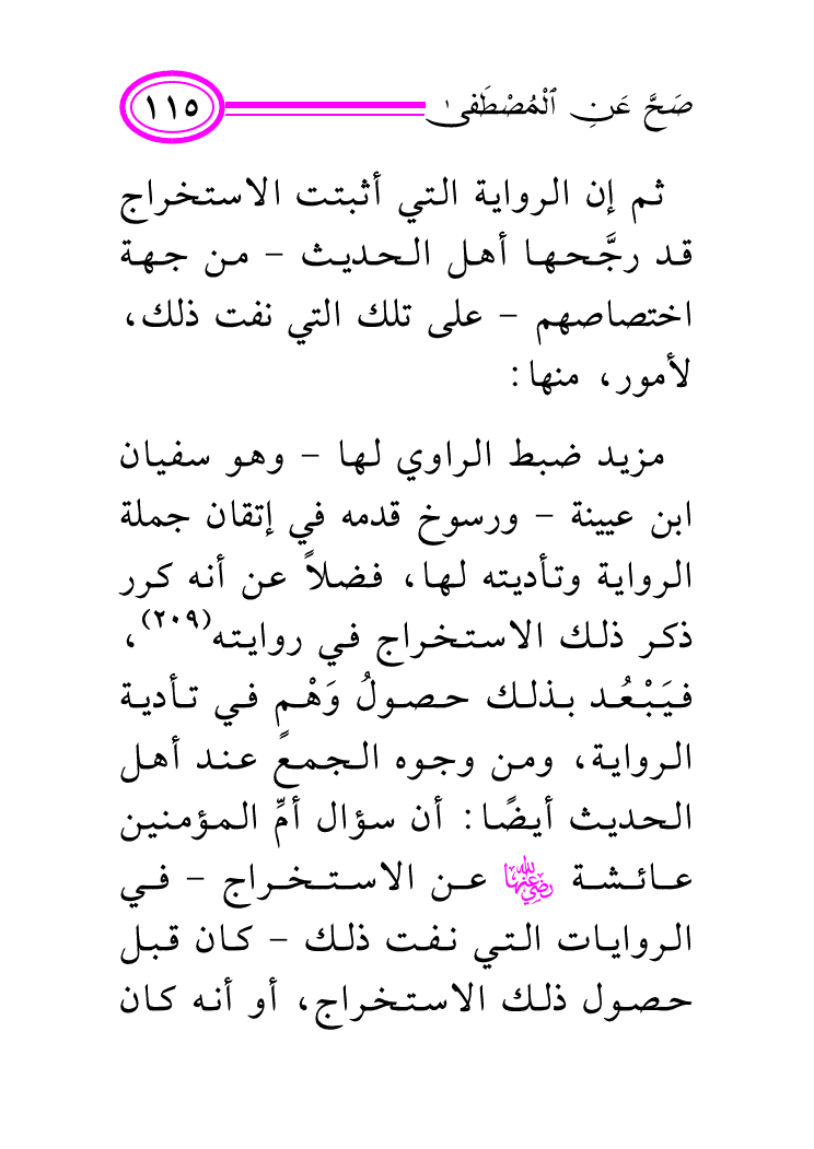 مزيد ضبط الراوي لها - وهو سفيان ابن عيينة - ورسوخ قدمه في إتقان جملة الرواية وتأديته لها، فضلاً عن أنه كرر ذكر ذلك الاستخراج في روايته (¬209) ، فيَبْعُد بذلك حصولُ وَهْمٍ في تأدية الرواية، ومن وجوه الجمع عند أهل الحديث أيضًا: أن سؤال أمِّ المؤمنين عائشة رضي الله عنها عن الاستخراج - في الروايات التي نفت ذلك - كان قبل حصول ذلك الاستخراج، أو أنه كان