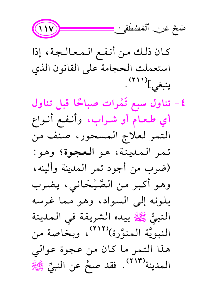 4- ... تناول سبع تَمْرات صباحًا قبل تناول أي طعام أو شراب، وأنفع أنواع التمر لعلاج المسحور، صنف من تمر المدينة، هو العجوة؛ وهو: (ضرب من أجود تمر المدينة وألينه، وهو أكبر من الصَّيْحَاني، يضرب بلونه إلى السواد، وهو مما غرسه النبيُّ صلى الله عليه وسلم بيده الشريفة في المدينة النبويَّة المنوَّرة) (¬212) ، وبخاصة من هذا التمر ما كان من عجوة عوالي المدينة (¬213) . فقد صحَّ عن النبيِّ صلى الله عليه وسلم