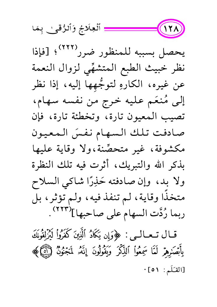 قال تعالى: {وَإِنْ يَكَادُ الَّذِينَ كَفَرُوا لَيُزْلِقُونَكَ بِأَبْصَارِهِمْ لَمَّا سَمِعُوا الذِّكْرَ وَيَقُولُونَ إِنَّهُ لَمَجْنُونٌ *} [القَلَم: 51] .