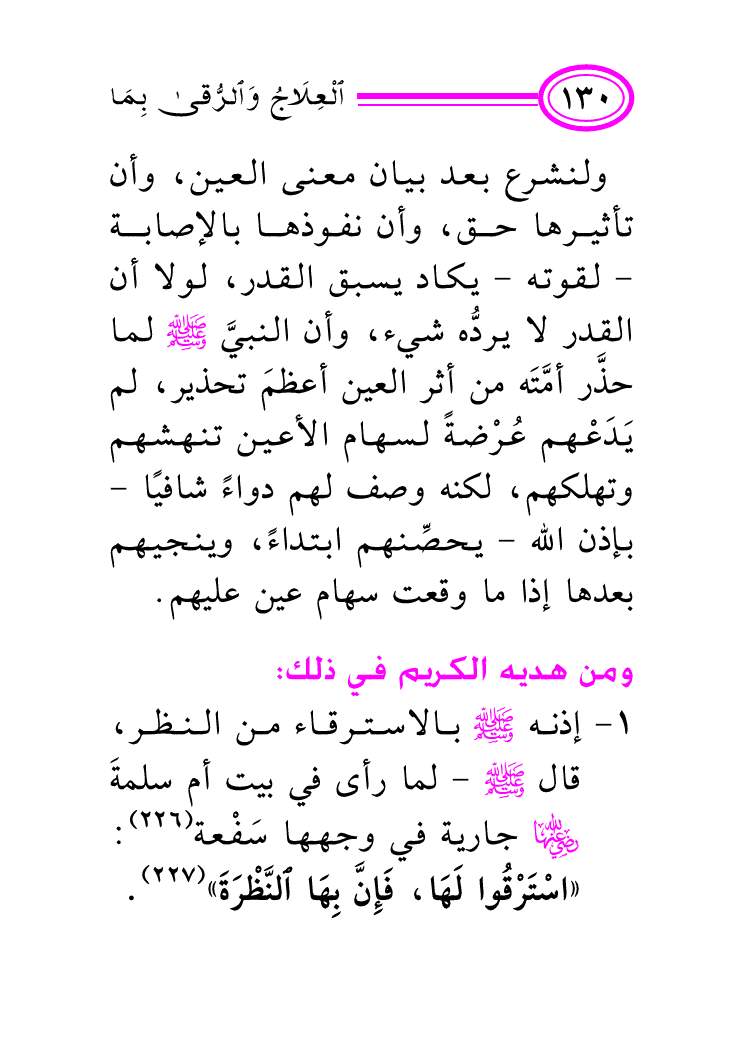 (¬227) متفق عليه من حديث أم سلمة رضي الله عنها: أخرجه البخاري، كتاب الطب، باب: رقية العين: برقم (5739) ، ومسلم؛ كتاب: السلام، باب: استحباب الرقية من العين، برقم (2197) .