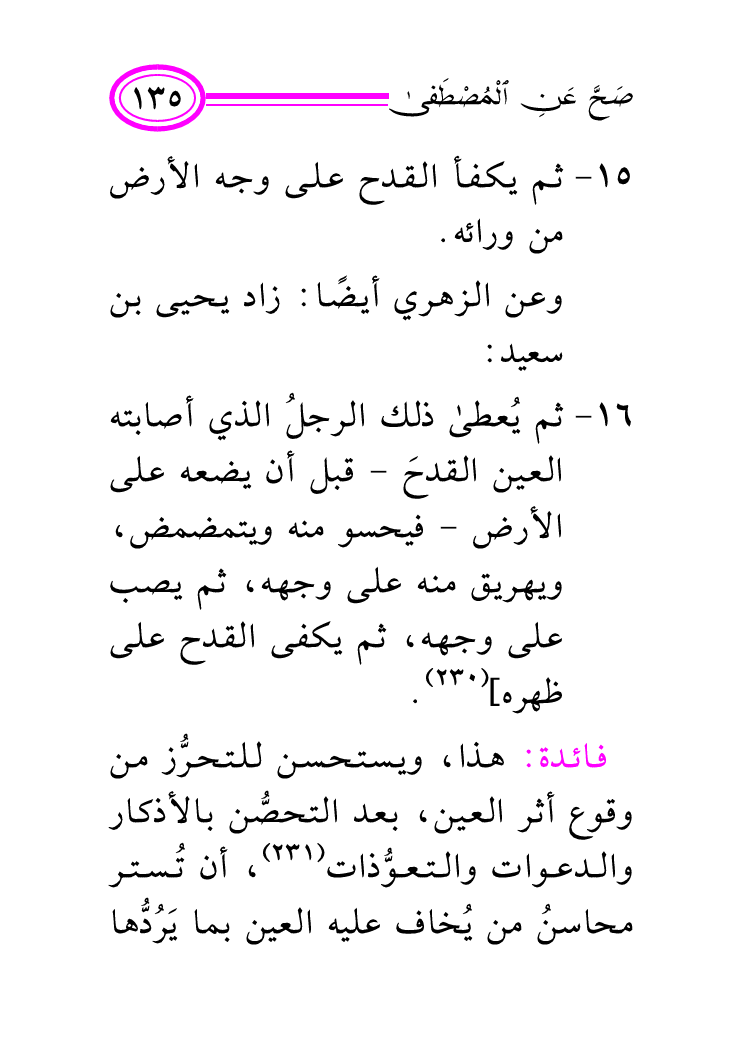(¬230) ذكر هذه الهيئة المفصّلة البيهقيُّ في «الكبرى» ؛ كتاب: الضحايا، باب: الاستغسال للعين (9/352) . وذلك عَقِب روايته حديثَ سهلٍ رضي الله عنه.