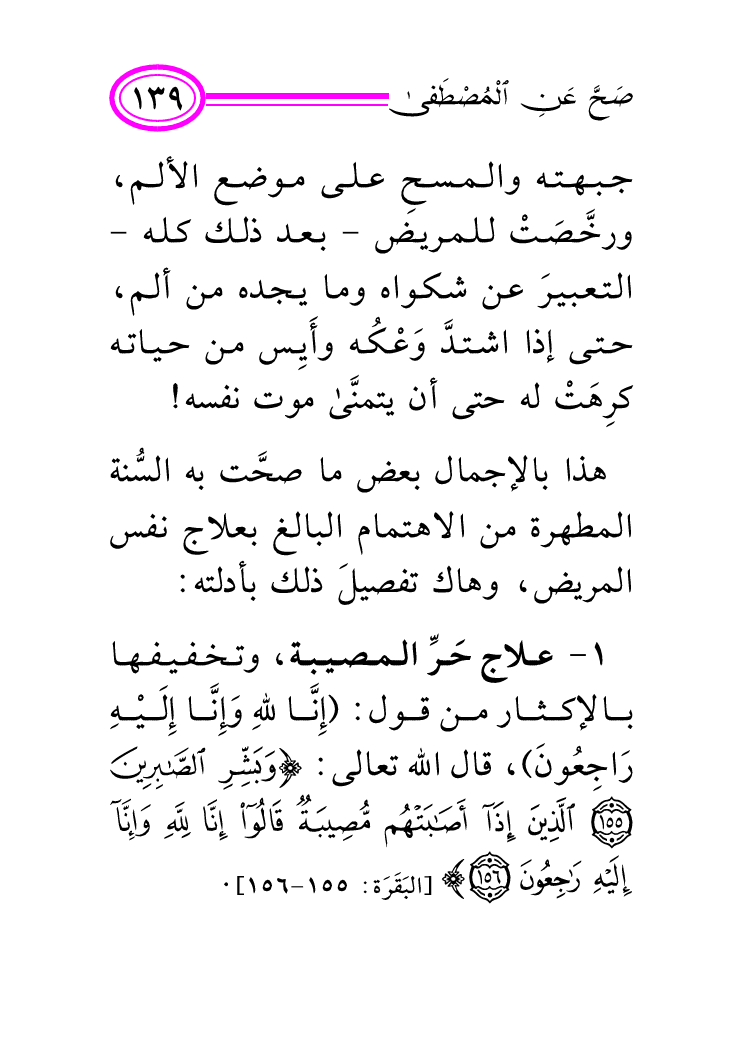 جبهته والمسحِ على موضع الألم، ورخَّصَتْ للمريض - بعد ذلك كله - التعبيرَ عن شكواه وما يجده من ألم، حتى إذا اشتدَّ وَعْكُه وأَيِس من حياته كرِهَتْ له حتى أن يتمنَّى موت نفسه!