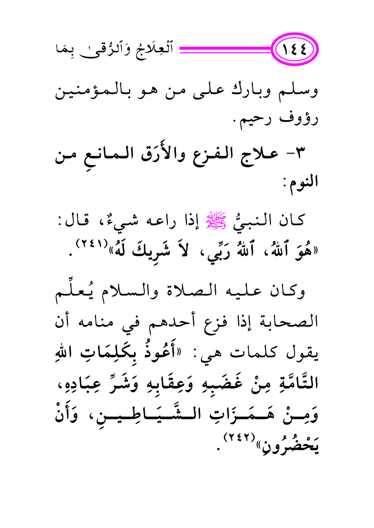 وكان عليه الصلاة والسلام يُعلِّم الصحابة إذا فزع أحدهم في منامه أن يقول كلمات هي: «أَعُوذُ بِكَلِمَاتِ اللهِ التَّامَّةِ مِنْ غَضَبِهِ وَعِقَابِهِ وَشَرِّ عِبَادِهِ، وَمِنْ هَمَزَاتِ الشَّيَاطِينِ، وَأَنْ يَحْضُرُونِ» (¬242) .