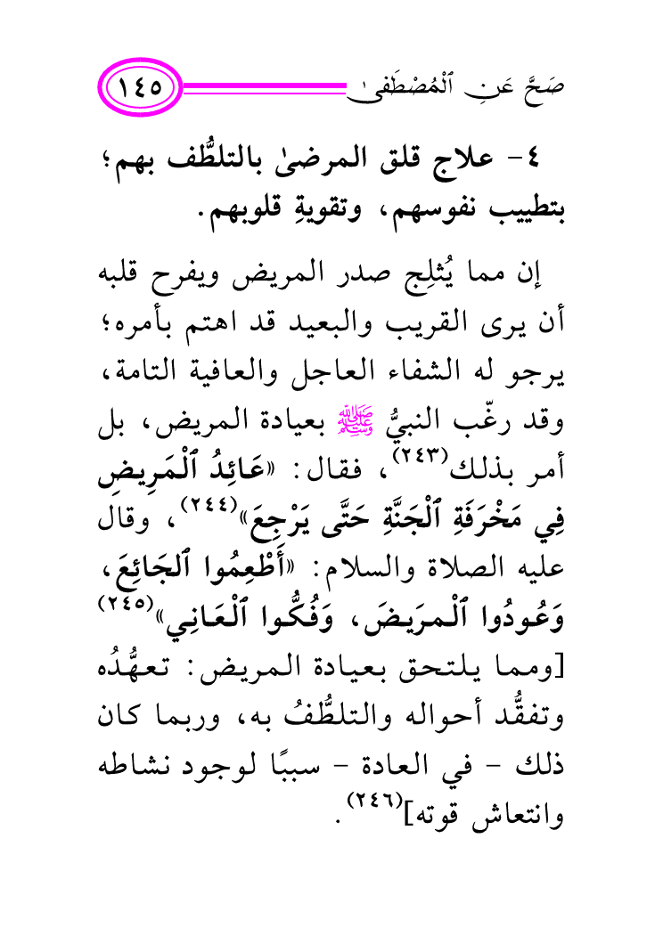 4- علاج قلق المرضى بالتلطُّف بهم؛ بتطييب نفوسهم، وتقويةِ قلوبهم.