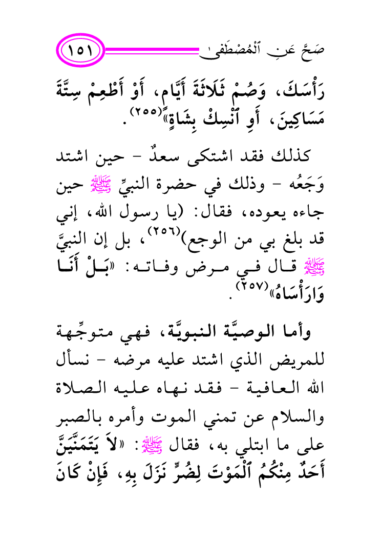 وأما الوصيَّة النبويَّة، فهي متوجِّهة للمريض الذي اشتد عليه مرضه - نسأل الله العافية - فقد نهاه عليه الصلاة والسلام عن تمني الموت وأمره بالصبر على ما ابتلي به، فقال صلى الله عليه وسلم: «لاَ يَتَمَنَّيَنَّ أَحَدٌ مِنْكُمُ الْمَوْتَ لِضُرٍّ نَزَلَ بِهِ، فَإِنْ كَانَ