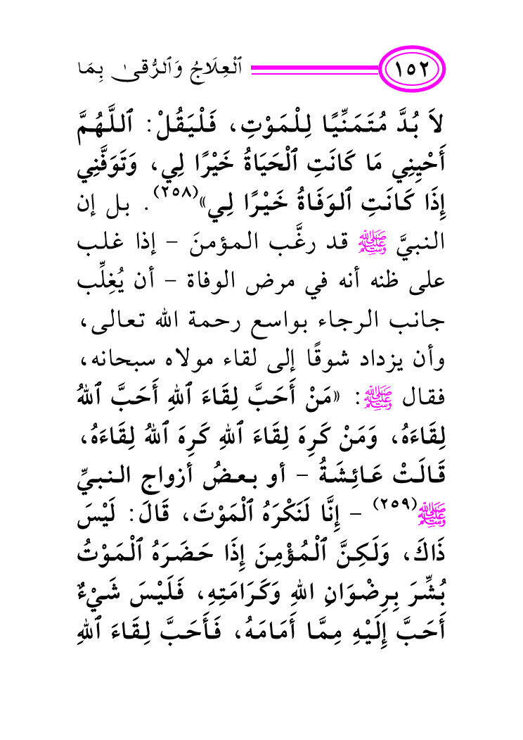 لاَ بُدَّ مُتَمَنِّيًا لِلْمَوْتِ، فَلْيَقُلْ: اللَّهُمَّ أَحْيِنِي مَا كَانَتِ الْحَيَاةُ خَيْرًا لِي، وَتَوَفَّنِي إِذَا كَانَتِ الوَفَاةُ خَيْرًا لِي» (¬258) . بل إن النبيَّ صلى الله عليه وسلم قد رغَّب المؤمنَ - إذا غلب على ظنه أنه في مرض الوفاة - أن يُغِلِّب جانب الرجاء بواسع رحمة الله تعالى، وأن يزداد شوقًا إلى لقاء مولاه سبحانه، فقال صلى الله عليه وسلم: «مَنْ أَحَبَّ لِقَاءَ اللهِ أَحَبَّ اللهُ لِقَاءَهُ، وَمَنْ كَرِهَ لِقَاءَ اللهِ كَرِهَ اللهُ لِقَاءَهُ، قَالَتْ عَائِشَةُ - أو بعضُ أزواج النبيِّ صلى الله عليه وسلم (¬259)