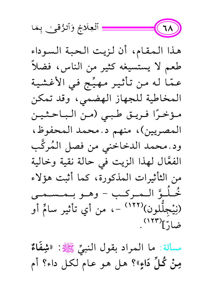 هذا المقام، أن لزيت الحبة السوداء طعم لا يستسيغه كثير من الناس، فضلاً عمّا له من تأثير مهيِّج في الأغشية المخاطية للجهاز الهضمي، وقد تمكن مؤخرًا فريق طبي (من الباحثين المصريين) ، منهم د. محمد المحفوظ، ود. محمد الدخاخني من فصل المُركَّب الفعَّال لهذا الزيت في حالة نقية وخالية من الثأثيرات المذكورة، كما أثبت هؤلاء خُلُوَّ المركب - وهو بمسمى (نِيْجِلُّلون) (¬122) -، من أي تأثير سامٍّ أو ضارّ] (¬123) .