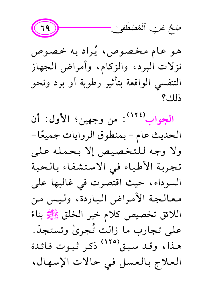 الجواب (¬124) : من وجهين؛ الأول: أن الحديث عام - بمنطوق الروايات جميعًا- ولا وجه للتخصيص إلا بحمله على تجربة الأطباء في الاستشفاء بالحبة السوداء، حيث اقتصرت في غالبها على معالجة الأمراض الباردة، وليس من اللائق تخصيص كلام خير الخلق صلى الله عليه وسلم بناءً على تجارب ما زالت تُجرى وتستجدّ. هذا، وقد سبق (¬125) ذكر ثبوت فائدة العلاج بالعسل في حالات الإسهال،