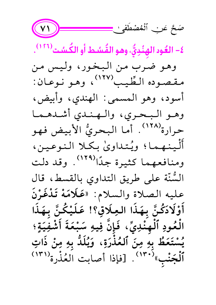 (¬126) كما عنون الإمام مسلم، باب: التداوي بالعود الهندي، وهو: الكُسْت. انظر: كتاب السلام من صحيحه، باب: رقم (28) . والقسط والكست لغتان؛ مثل: الكافور والقافور.
