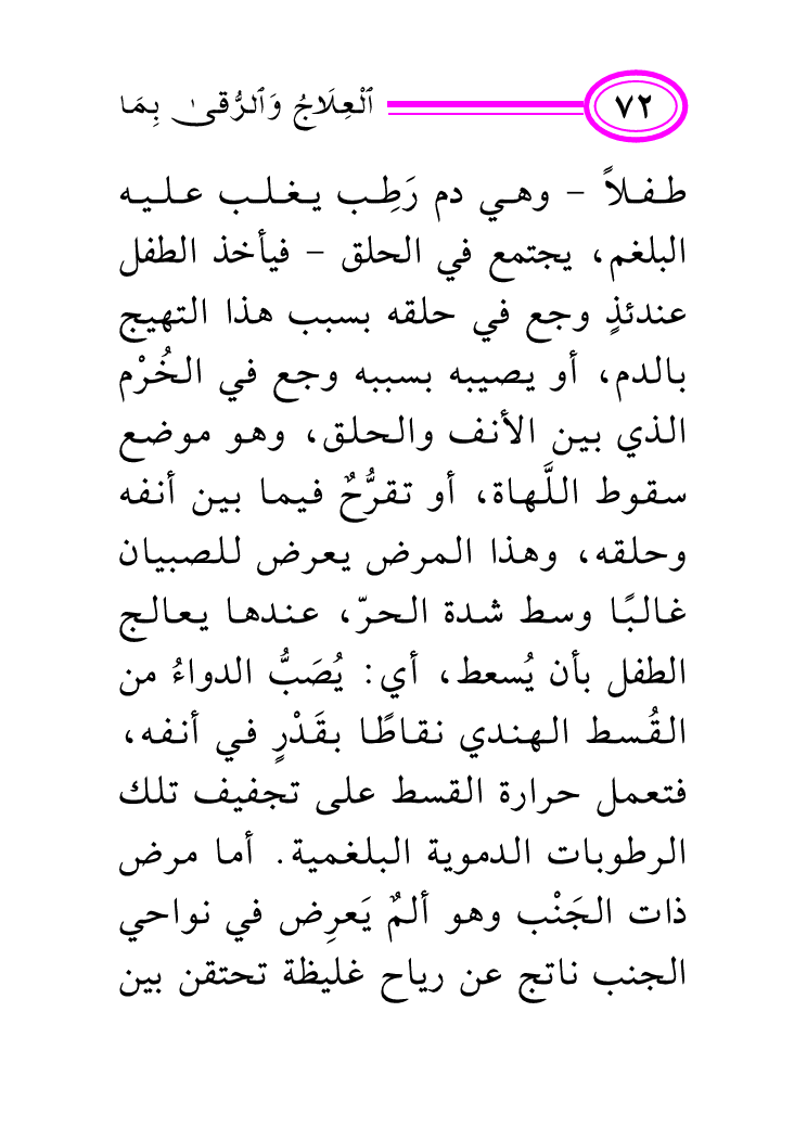 طفلاً - وهي دم رَطِب يغلب عليه البلغم، يجتمع في الحلق - فيأخذ الطفل عندئذٍ وجع في حلقه بسبب هذا التهيج بالدم، أو يصيبه بسببه وجع في الخُرْم الذي بين الأنف والحلق، وهو موضع سقوط اللَّهاة، أو تقرُّحٌ فيما بين أنفه وحلقه، وهذا المرض يعرض للصبيان غالبًا وسط شدة الحرّ، عندها يعالج الطفل بأن يُسعط، أي: يُصَبُّ الدواءُ من القُسط الهندي نقاطًا بقَدْرٍ في أنفه، فتعمل حرارة القسط على تجفيف تلك الرطوبات الدموية البلغمية. أما مرض ذات الجَنْب وهو ألمٌ يَعرِض في نواحي الجنب ناتج عن رياح غليظة تحتقن بين