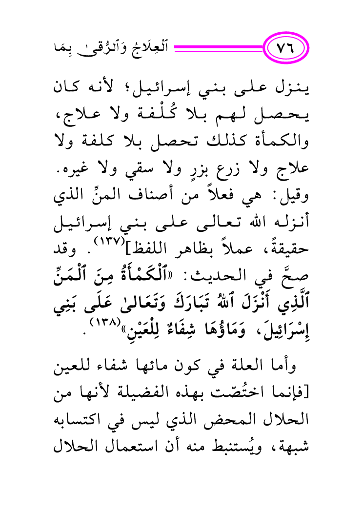 (¬138) أخرجه مسلم؛ كتاب: الأشربة، باب: فضل الكمأة ومداواة العين بها، برقم (2049) ، عن سعيد بن زيد رضي الله عنهما.