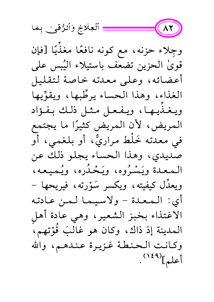 وجِلاء حزنه، مع كونه نافعًا مغذِّيًا [فإن قوى الحزين تضعف باستيلاء اليُبس على أعضائه، وعلى معدته خاصة لتقليل الغذاء، وهذا الحساء يرطِّبها، ويقوِّيها ويغذِّيها، ويفعل مثل ذلك بفؤاد المريض، لأن المريض كثيرًا ما يجتمع في معدته خَلْط مراريٌّ، أو بلغمي، أو صديدي، وهذا الحساء يجلو ذلك عن المعدة ويَسْرُوه، ويَحْدُره، ويُميعه، ويعدِّل كيفيته، ويكسر سَوْرته، فيريحها - أي: المعدة - ولاسيما لمن عادته الاغتذاء بخبز الشعير، وهي عادة أهلِ المدينة إذ ذاك، وكان هو غالبَ قُوْتهم، وكانت الحنطة غزيرة عندهم، والله أعلم] (¬149) .