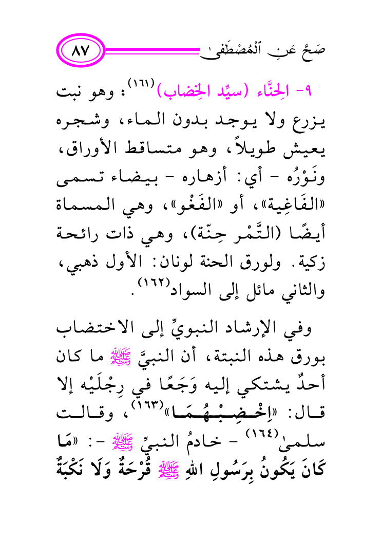 وفي الإرشاد النبويِّ إلى الاختضاب بورق هذه النبتة، أن النبيَّ صلى الله عليه وسلم ما كان أحدٌ يشتكي إليه وَجَعًا في رِجْلَيْه إلا قال: «اِخْضِبْهُمَا» (¬163) ، وقالت سلمى (¬164) - خادمُ النبيِّ صلى الله عليه وسلم -: «مَا كَانَ يَكُونُ بِرَسُولِ اللهِ صلى الله عليه وسلم قُرْحَةٌ وَلاَ نَكْبَةٌ