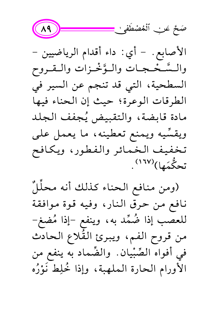 الأصابع. - أي: داء أقدام الرياضيين - والسَّحْجات والوَّخْزات والقروح السطحية، التي قد تنجم عن السير في الطرقات الوعرة؛ حيث إن الحناء فيها مادة قابضة، والتقبيض يُجفف الجلد ويقسِّيه ويمنع تعطينه، ما يعمل على تخفيف الخمائر والفطور، ويكافح تحكُّمَها) (¬167) .