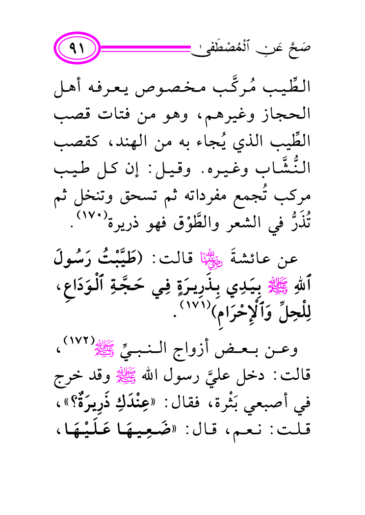 (¬171) متفق عليه: أخرجه البخاري؛ كتاب: اللباس، باب: الذريرة، برقم (5930) ، ومسلم؛ كتاب: الحجّ، باب: الطيب للمُحرِم عند الإحرام، برقم (1189) .