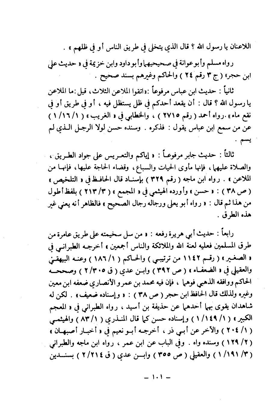 ثانيا: حديث ابن عباس مرفوعا: " اتقوا الملاعن الثلاث , قيل: ما الملاعن يا رسول الله؟ قال: أن يقعد أحدكم فى ظل يستظل فيه , أو فى طريق أو فى نقع ماء ".
